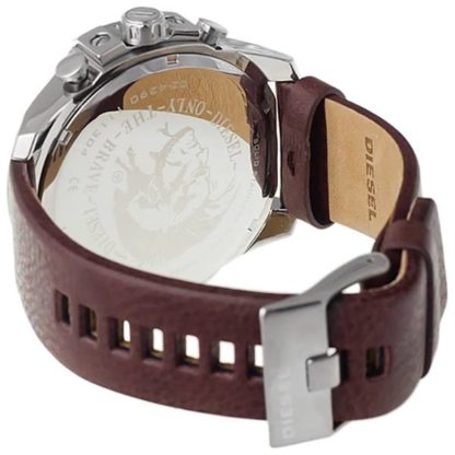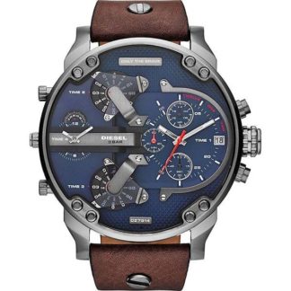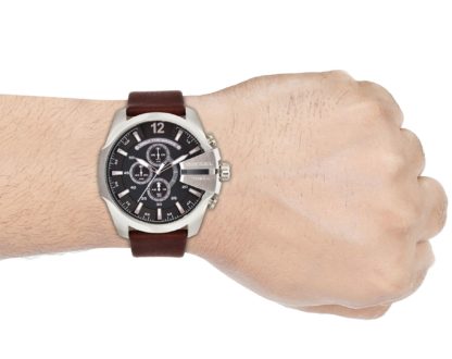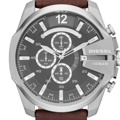 Stainless steel case with a brown leather strap. Fixed stainless steel bezel. Grey dial with luminous silver-tone hands and index hour markers. An Arabic numeral marks the 12 o’clock position. Minute markers around the outer rim. Dial Type: Analog. Luminescent hands and markers. Date display at the 3 o’clock position. Chronograph-three sub-dials displaying: 60 seconds, 60 minute and 1/10th of a second. Quartz movement. Scratch resistant mineral crystal. Pull / push crown. Solid case back. Case dimensions: 59 mm x 51 mm. Case thickness: 15 mm. Round case shape. Band width: 24 mm. Band length: 8.5 inches. Tang clasp. Water resistant at 50 meters / 165 feet. Functions: chronograph, date, hour, minute, second. Casual watch style. Diesel Mega Chief Chronograph Grey Dial Brown Leather Men’s Watch DZ4290.