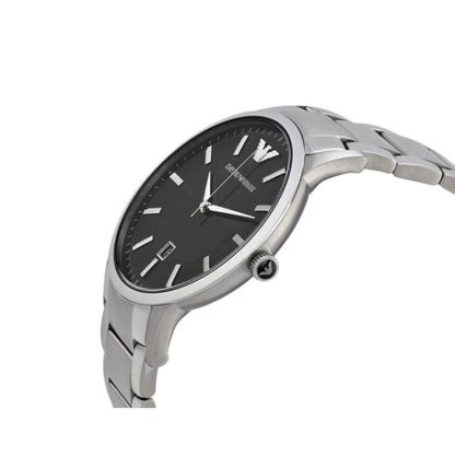 Men’s Emporio Armani watch in a very attractive, sleek design. This model is made from stainless steel and has a round case. The high-visibility dial in black features silver baton hour markers with the Emporio Armani logo at 12 o’clock, slender silver hands and date function. It fastens with a stainless steel bracelet and powered by a quality quartz movement.